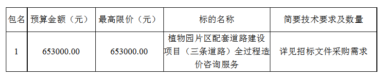 內(nèi)容:負(fù)責(zé)完成植物園片區(qū)配套道路建設(shè)項目(三條道路)全過程造價咨詢服務(wù)工作,具體服務(wù)內(nèi)容見招標(biāo)文件采購需求。